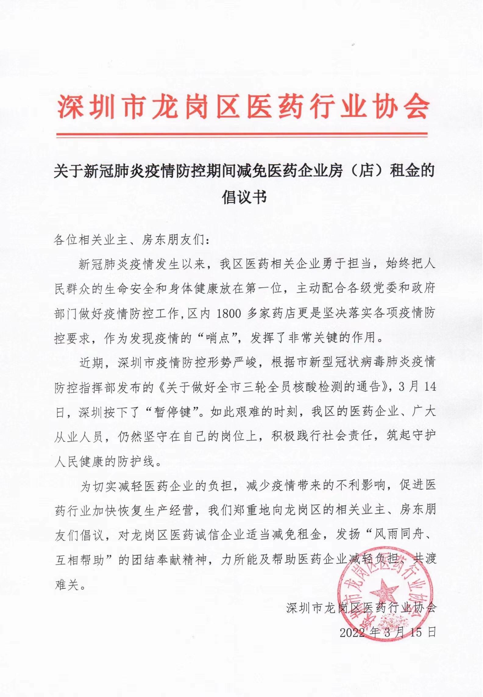 关于新冠肺炎疫情防控期间减免医药企业房(店)租金的倡议书